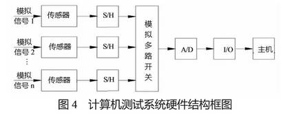 計算機測試系統(tǒng)硬件包括傳感器、AD轉(zhuǎn)換器、輸入/輸出接口電路計算機等[5]。負壓測試采用多路共享AD轉(zhuǎn)換方式,完成多個負壓值的測量。硬件系統(tǒng)結(jié)構(gòu)如圖4所示。多個模擬信號通過傳感器連接到采樣1保持(S/H)設備,將待采集的信號發(fā)送到多路復用器。輸入 1 輸出 (I/O) 接口的最終數(shù)據(jù)轉(zhuǎn)換會將數(shù)字量傳輸?shù)街鳈C。